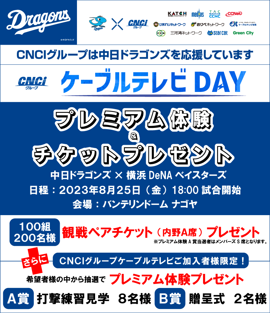 HOME>お知らせ>三河湾ネットワークからのお知らせ>CNCIグループ ケーブルテレビDAY プレミアム体験&野球観戦チケットを100組200名様にプレゼント!
