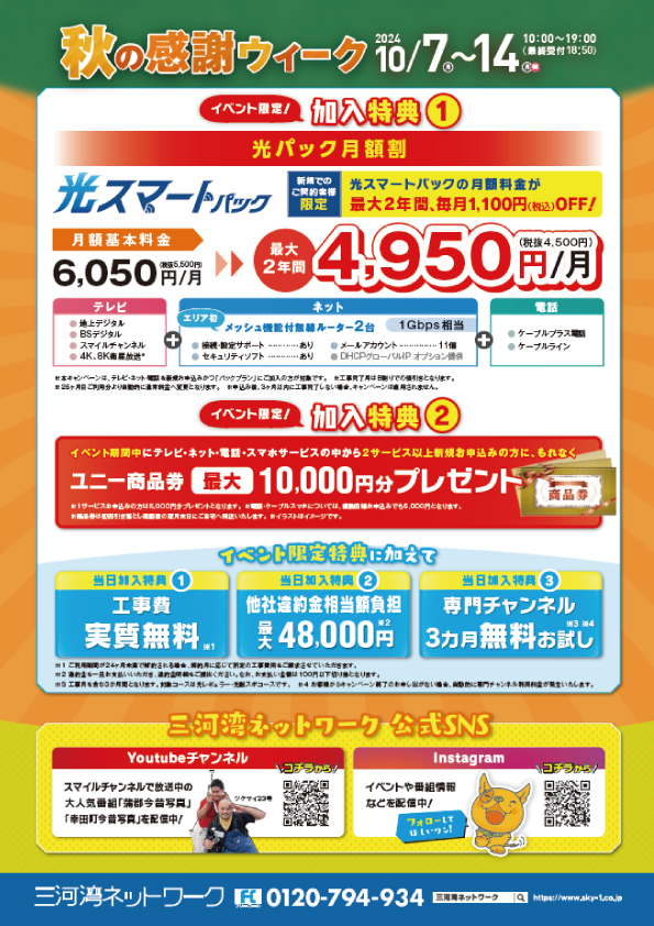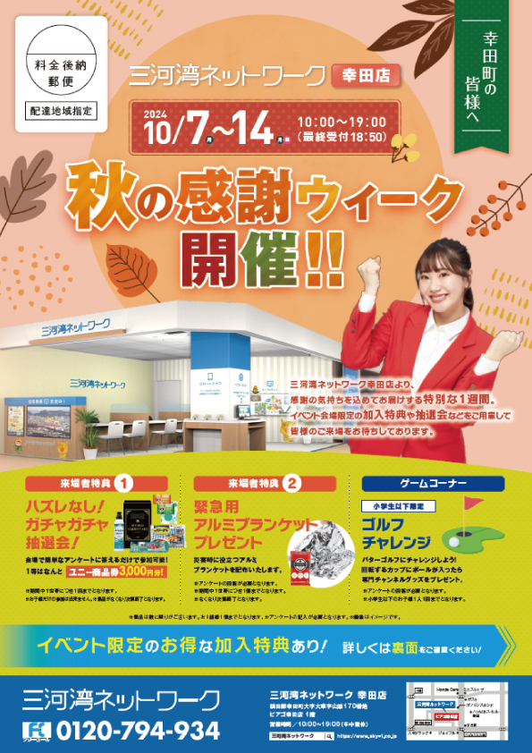 10/7(月)~14(祝)開催 三河湾ネットワーク幸田店 秋の感謝ウィーク開催
