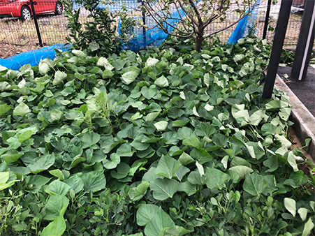 会社の畑で足の踏み場も無い程にまで成長してしまったサツマイモも風で吹き飛ばされないか心配です。