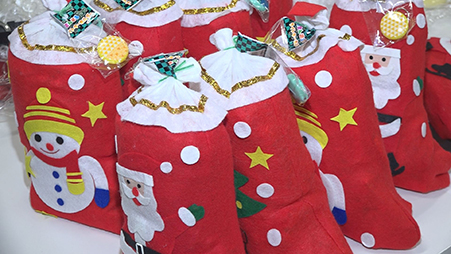 各家庭の子供たちに配られたのは赤い長靴に入ったお菓子。