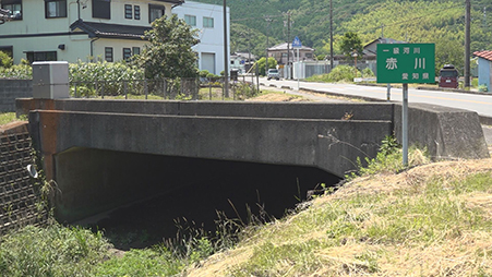 広田川の支流である赤川は菱池遊水地の周りから野場地区にある山へと続いています。