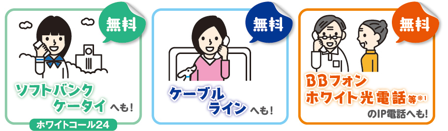 ソフトバンク携帯電話からソフトバンクが提供するIP電話サービスへの国内通話が24時間無料となるサービス。 ・国際サービス、TVコール、64kデジタルデータ通信は本サービスの対象外になります。 ・ホワイトライン24[モバイル]との併用はできません。 ・ソフトバンクが指定する特定の事業者が有する「BBフォン」への通話をご利用される場合、無料の対象外となります。詳しくはソフトバンクホームページをご確認ください。 |