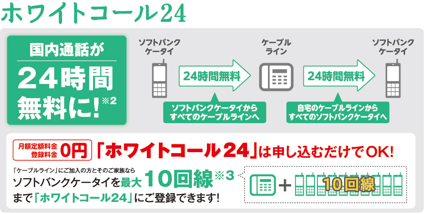 加入条件 | 1.「ケーブルライン」をご利用のお客さまであること。 2.本サービスにお申し込みのお客さま本人、またはご家族が、ソフトバンクが提供する通話料割引サービス「ホワイトコール24」へお申し込みいただいていること。 |
