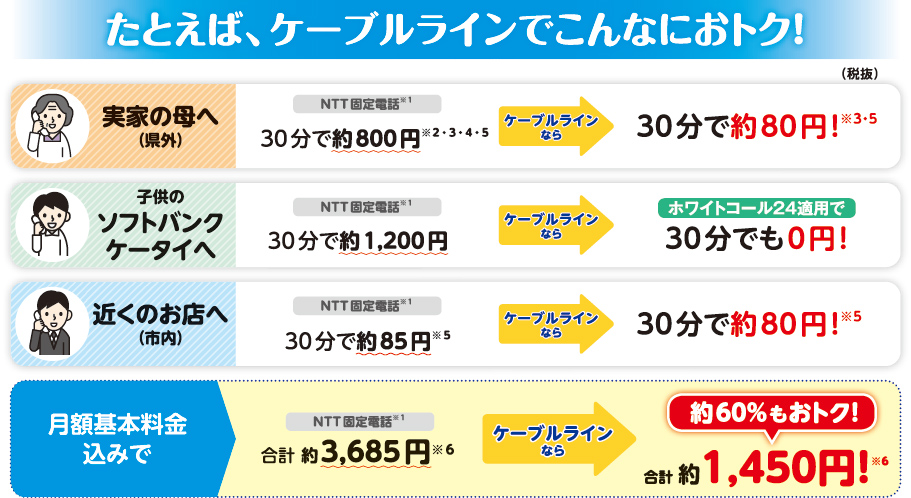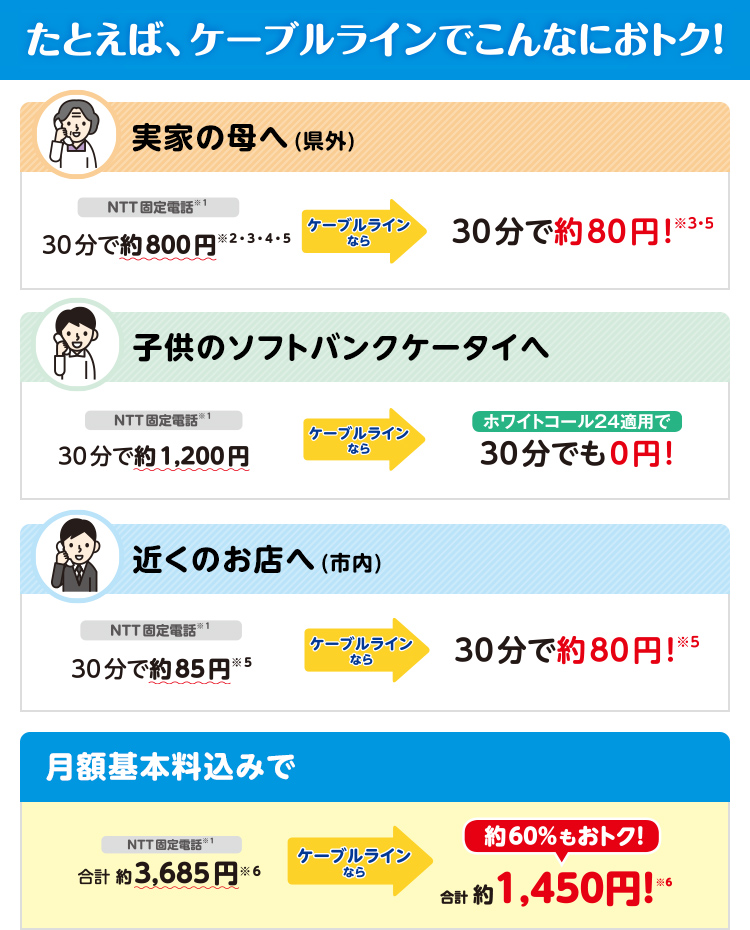 ※2 ソフトバンク携帯電話と「ケーブルライン」の各サービスの利用料金が別途必要となります。ソフトバンク携帯電話のご利用は「ホワイトプラン」、「標準プラン」、「通話定額基本料(※4)」「通話基本プラン」「基本プラン(音声)」のいずれかの月額基本使用料とユニバーサルサービス料が必要となります。「ケーブルライン」のご利用には「ケーブルライン」の月額利用料金、ユニバーサルサービス料が必要となります。