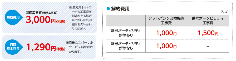 ※現在ご利用の電話番号を継続する場合(番号ポータビリティあり)は、上記以外にNTTからNTT回線休止工事費として別途2,000円(税込2,200円)がNTTからお客様へ直接請求されます。