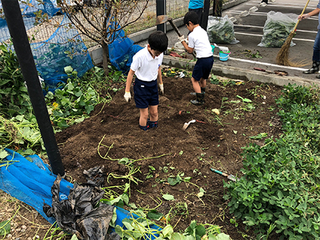 子どもたちは土にまみれながらひたすら茎や葉っぱを掻き分けてくれました。