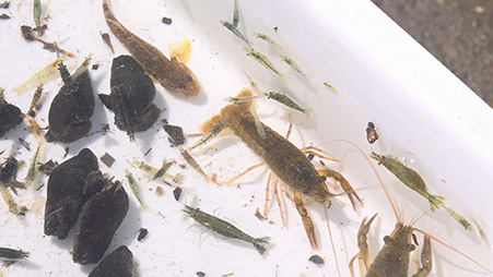 そしてタモをあげるとザリガニやエビ、またカワムツなどたくさんの生物が・・・。