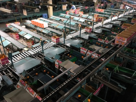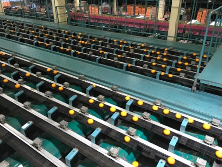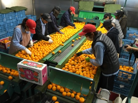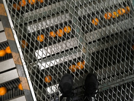 人の手で傷の有無などを確認されたみかんは、私の足元を通って、次の選別へと進んでいきます。