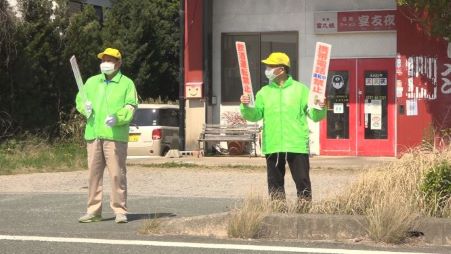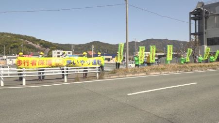 シートベルトの着用・飲酒運転追放を啓発するのぼりや、ハンドプレートを持ち、通行車両に向けて呼びかけを行いました!