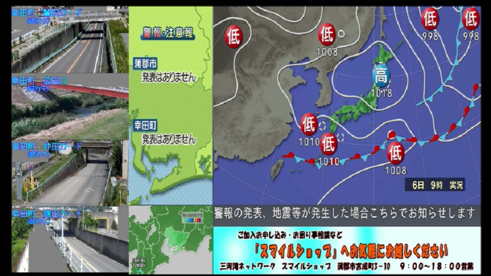 6月1日(水)から、お天気チャンネル(地上デジタル111ch)におきまして、従来の天気予報等の情報と併せて、「幸田町 道路・河川ライブカメラ(試行中)」)に掲載されております、幸田町内に設置された防災対策のためのライブカメラ映像を放送しております。