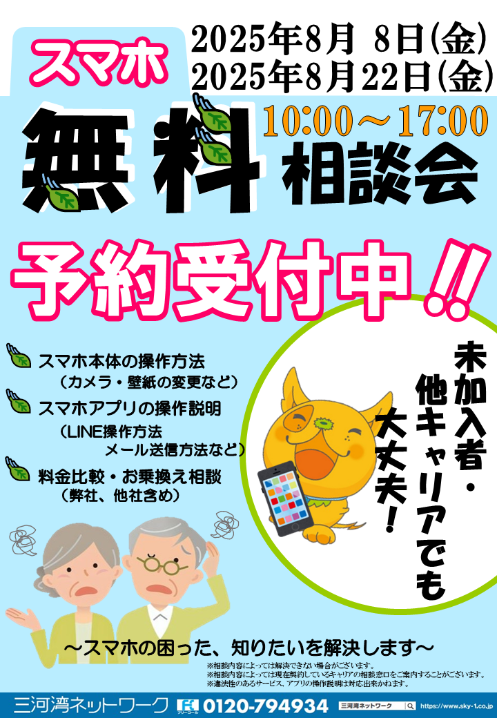 スマホ使い方相談会開催のお知らせ【8/8(金),8/22(金)ピアゴ幸田店 8/26(火)アピタ蒲郡店】