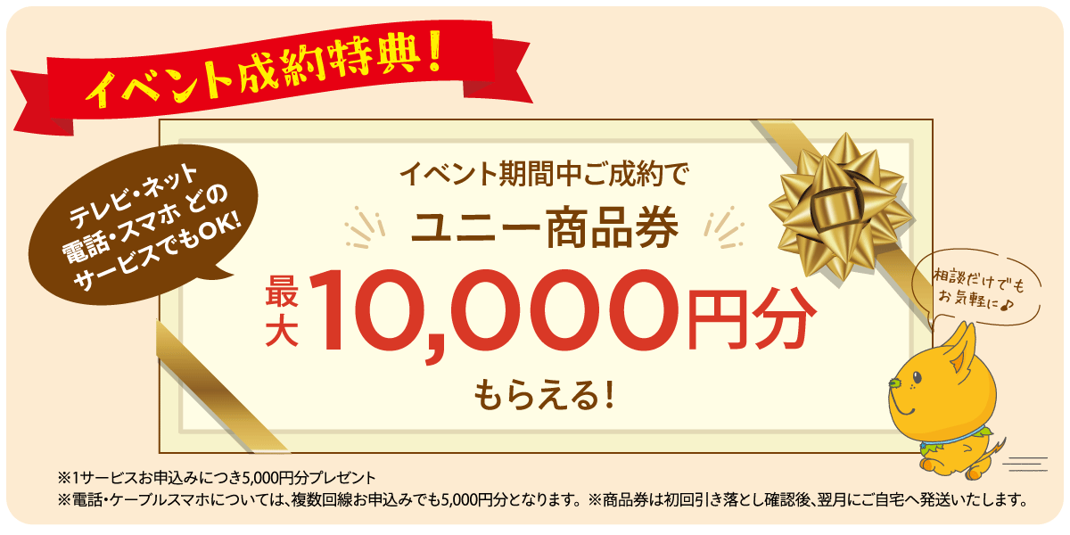 イベント期間中、幸田店でケーブルテレビ・インターネット・電話・スマホの新規ご成約で、ピアゴで使える「ユニー商品券」を最大10,000円分をプレゼント!