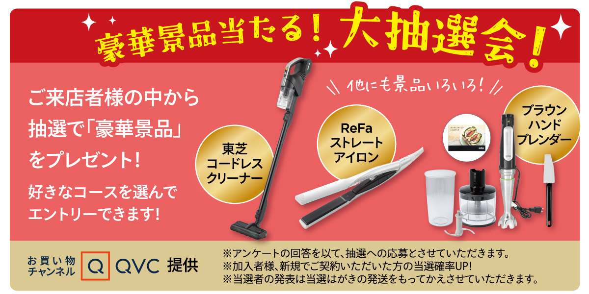 「Re-Fa ストレートアイロン」や「東芝 コードレスクリーナー」などが当たる大抽選会を開催します。どんな景品が当たるかは会場でぜひご確認ください。