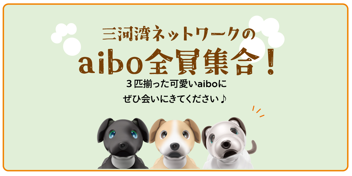 三河湾ネットワークのaibo「シロ」「クロ」「キナコ」が大集合!3匹揃った可愛い姿をぜひご覧ください。