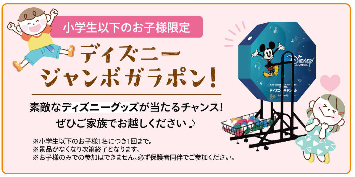 小学生以下のお子様限定!素敵なディズニーグッズが当たるジャンボガラポン抽選会を開催します。