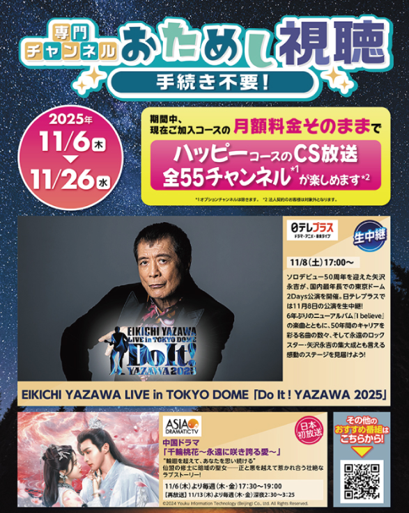HOME>お知らせ>三河湾ネットワークからのお知らせ>専門チャンネルおためし視聴!(11/6~11/26)