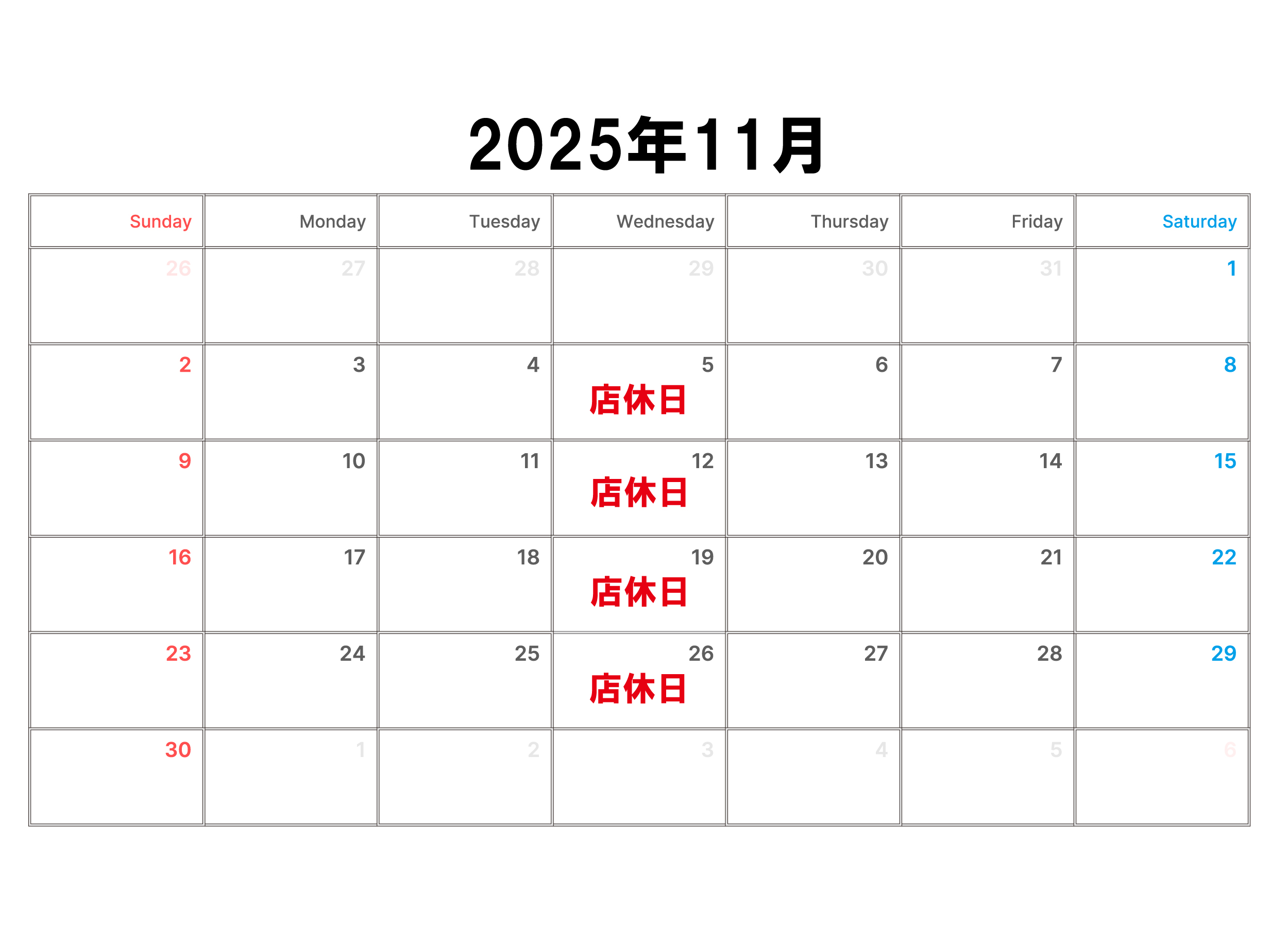誠に勝手ながら、2025年11月の毎週水曜日を店休日とさせていただきます。