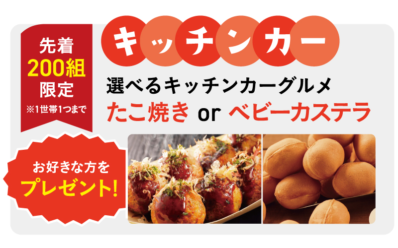 先着200組様限定!「たこ焼き」または「ベビーカステラ」どちらかお好きな方の引換券をプレゼント。