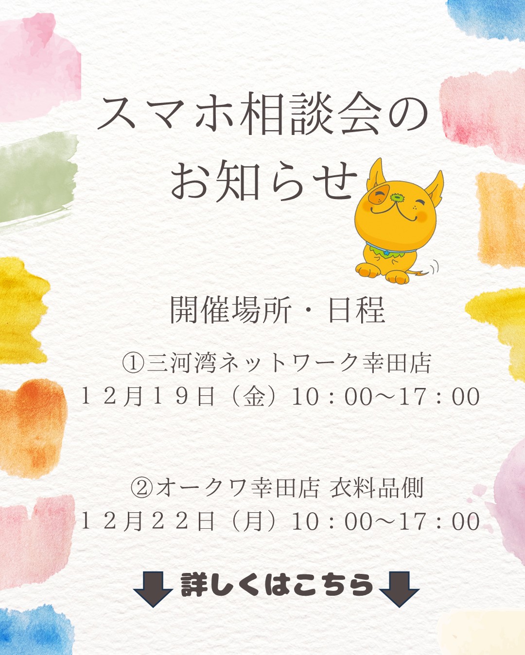 スマホ使い方相談会開催のお知らせ【12/19(金)ピアゴ幸田店 12/22(月)オークワ幸田店】