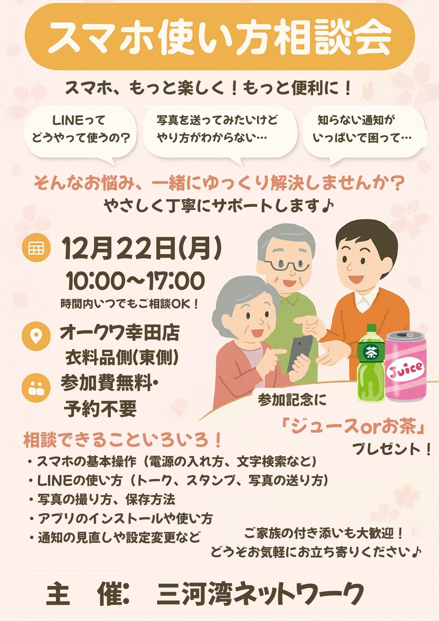 - 2025/12/08(月)スマホ使い方相談会開催のお知らせ【12/19(金)ピアゴ幸田店 12/22(月)オークワ幸田店】