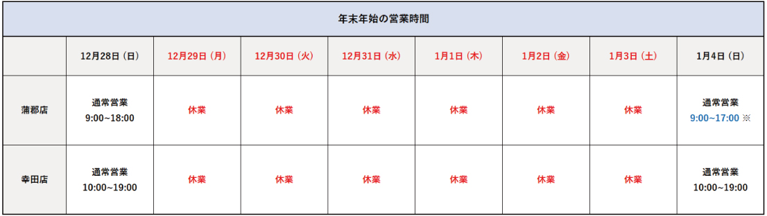 - 2025/12/15(月)三河湾ネットワーク蒲郡店・幸田店 年末年始休業日のお知らせ
