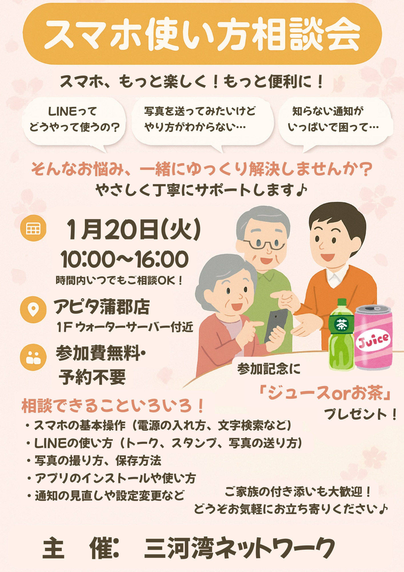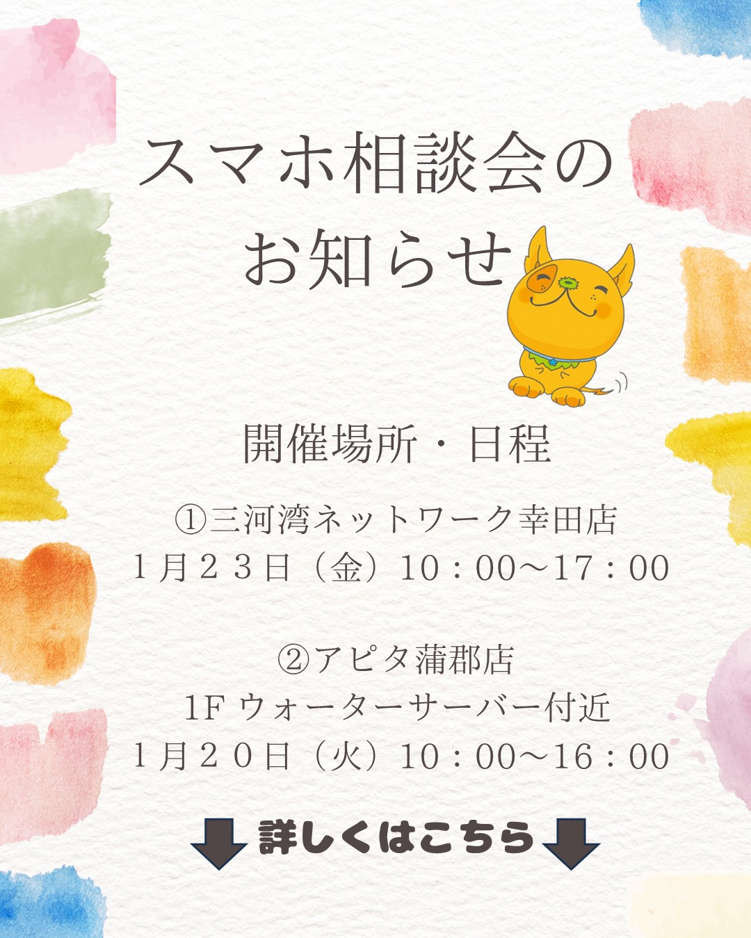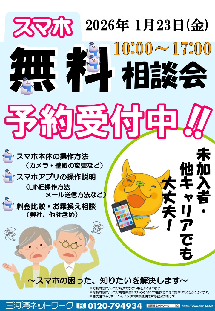 - 2026/01/09(金)スマホ使い方相談会開催のお知らせ【1/23(金)ピアゴ幸田店 1/20(火)アピタ蒲郡店】