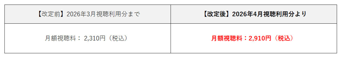 チャンネル提供元である株式会社フジテレビジョンの料金改定に伴い、2026年4月1日より 月額視聴料金を下記のとおりに改定させていただきます。