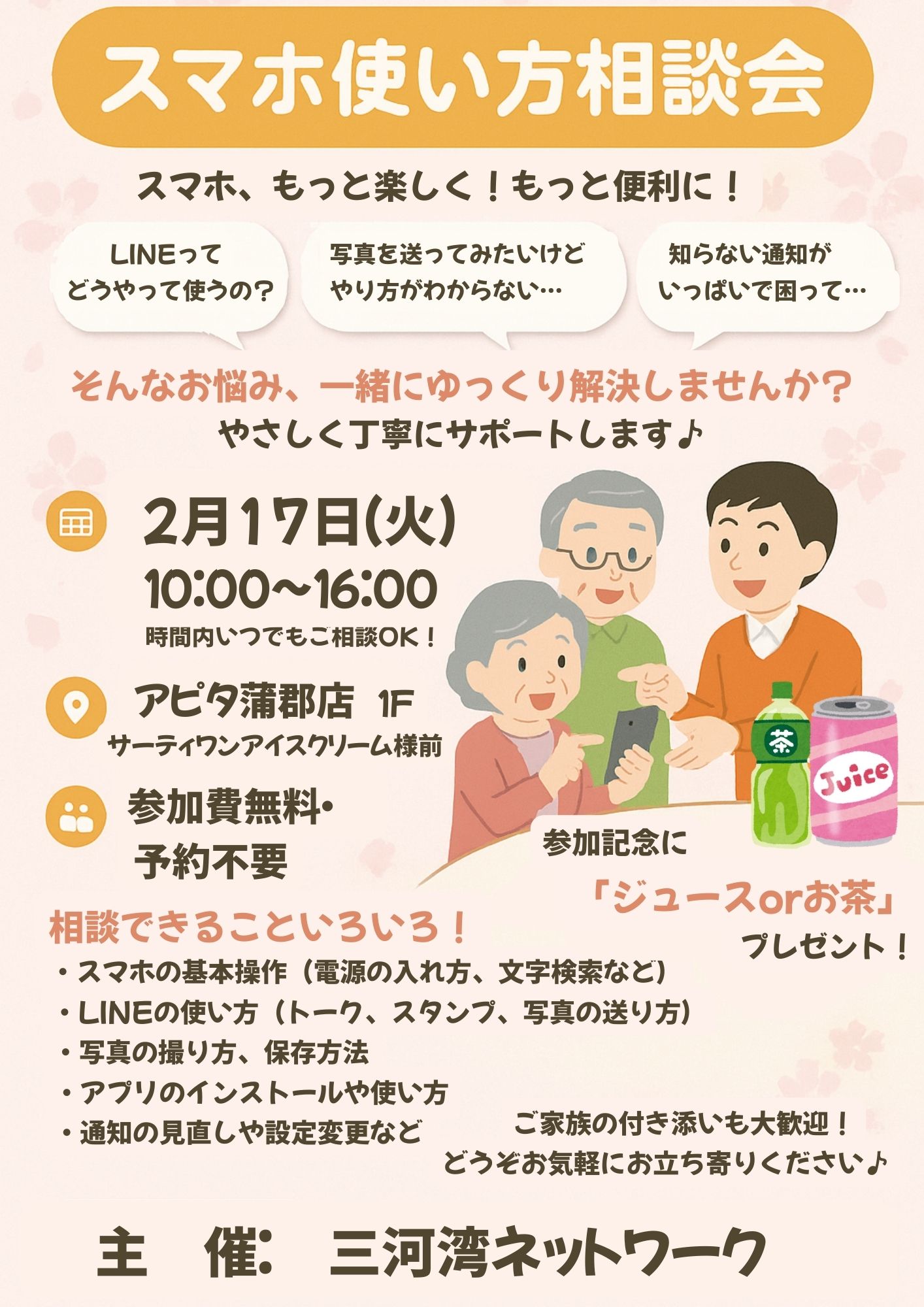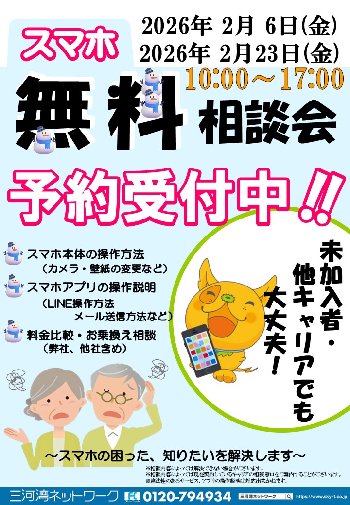 - 2026/02/01(日)スマホ使い方相談会開催のお知らせ【2/6(金),2/20(金)ピアゴ幸田店 2/17(火)アピタ蒲郡店】