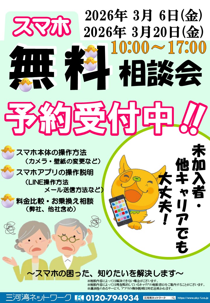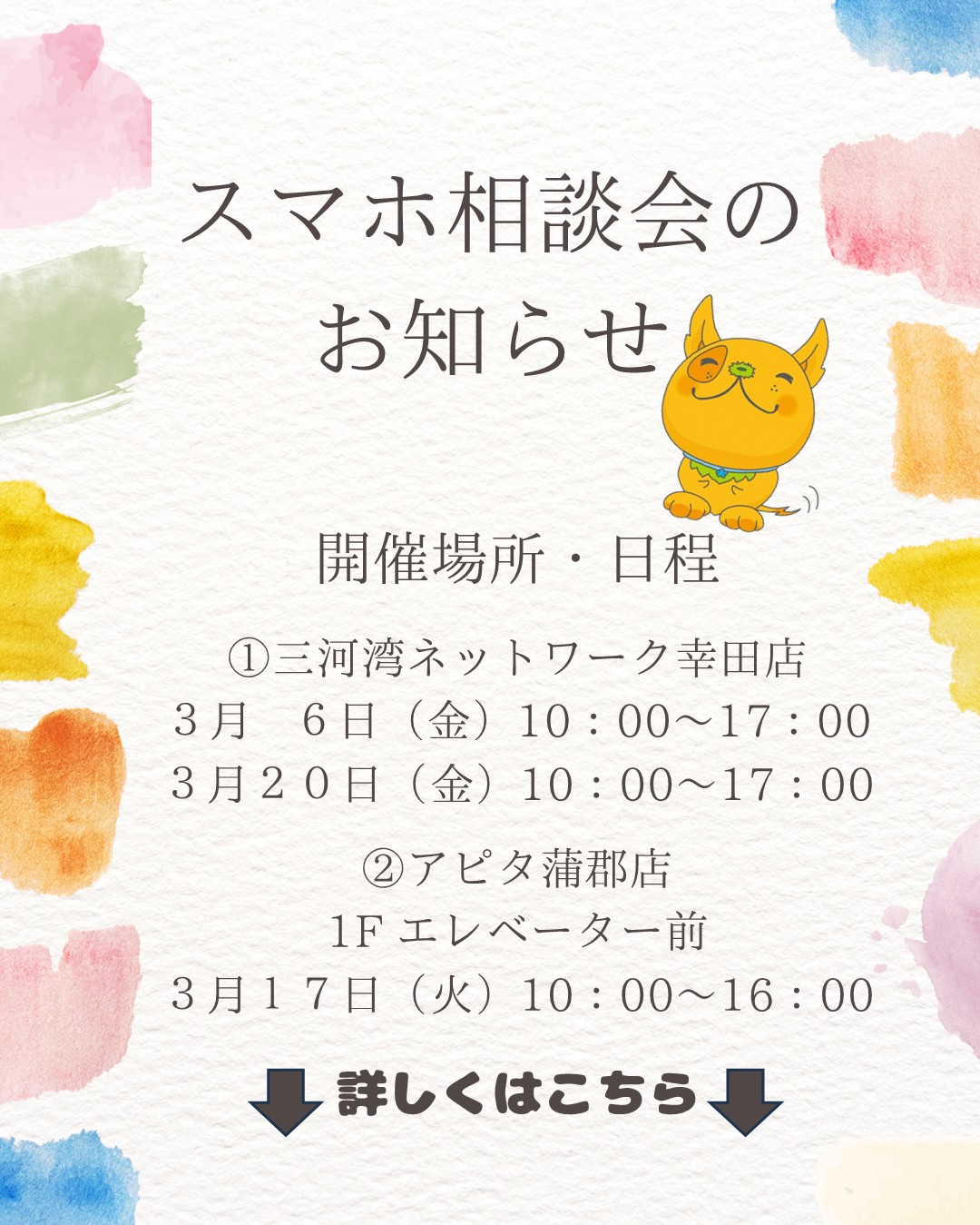 - 2026/02/27(金)スマホ使い方相談会開催のお知らせ【3/6(金),3/20(金)ピアゴ幸田店 3/17(火)アピタ蒲郡店】