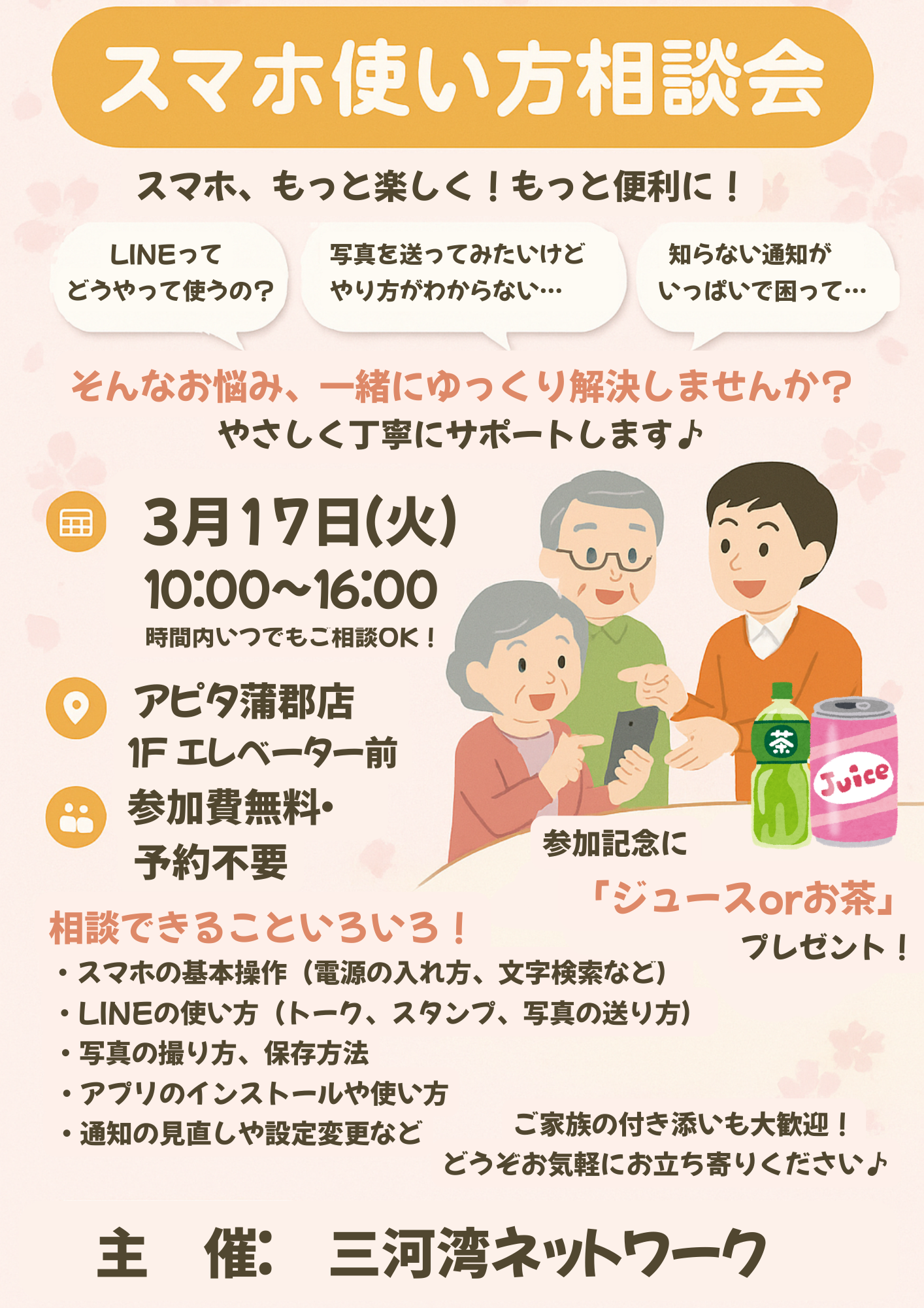 - 2026/02/01(日)スマホ使い方相談会開催のお知らせ【2/6(金),2/20(金)ピアゴ幸田店 2/17(火)アピタ蒲郡店】