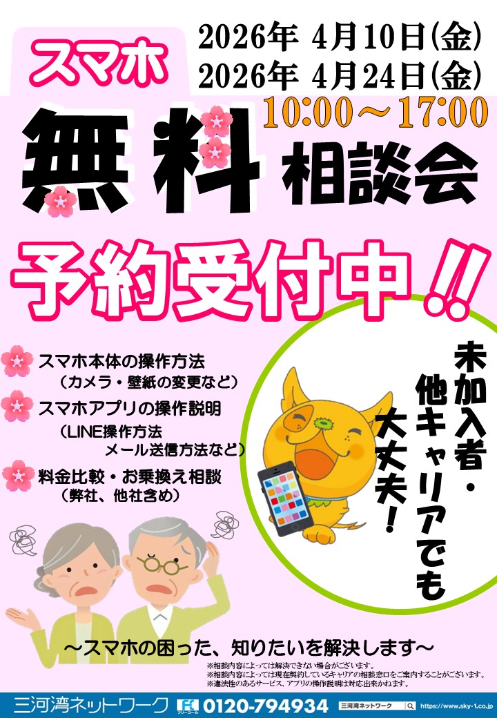 スマホ使い方相談会開催のお知らせ【4/10(金),4/24(金)ピアゴ幸田店 4/14(火)アピタ蒲郡店】