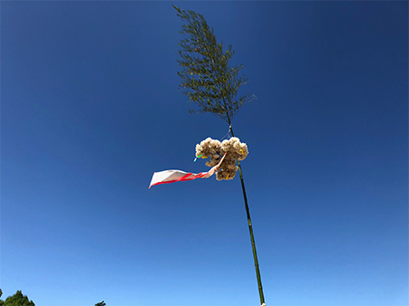 午後に割るはずのくす玉が強風に引っ張られ午前中の早い段階で割れてしまう