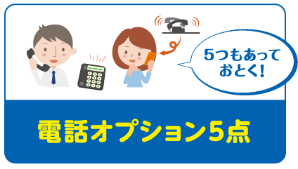 標準セットに含まれるオプションサービスは「発信番号表示」「割込通話」「割込番号表示」「番組通知リクエスト」「着信転送」です。