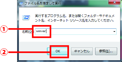 ①名前欄に『winver』と入力して ②『OK』をクリックします。